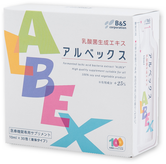 アルベックスは、100年の乳酸菌研究から生まれた医療機関専売の乳酸菌生成エキスです。選び抜かれた独自の16種類の乳酸菌から生成した高品質なエキスで、体内の乳酸菌環境をサポートする液体タイプの健康食品です。